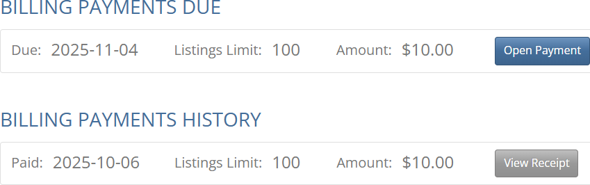 The bottom section named "Billing Payments History" displays a list of the past Plan Monthly Fees that you have already paid. Use the "View Receipt" button to view the details of the payment.