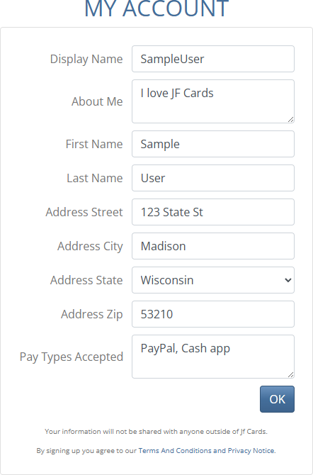 Enter your Name and Address. This will be used for shipping. Your personal information will never be shared with anyone outside of JF Cards.