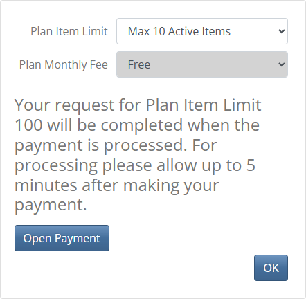 Your Plan Item Limit will be set after you make your first monthly payment. Please allow up to 5 minutes for processing after making the payment.