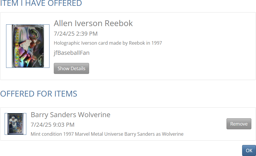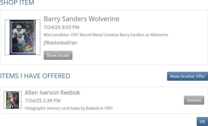Once you are done making offers for the shop item, click the "OK" button to be taken to the "Offers I have Made" page.