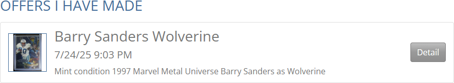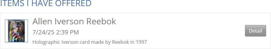 To view the details of your offers for a shop item on the "Offers I have Made" page, click the "Detail" button on the right side of the item.
