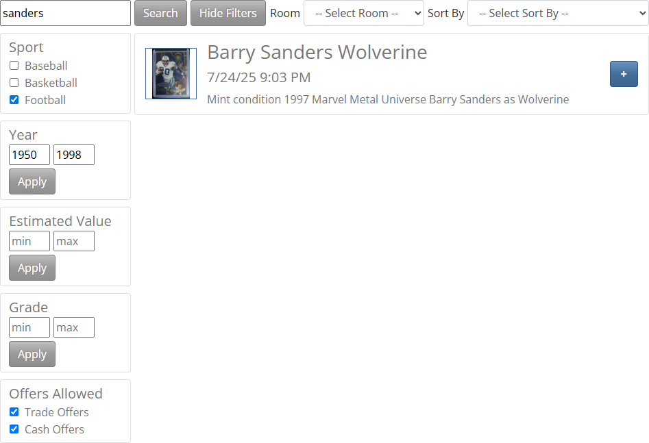 To view details of an item and be able to make an offer, click the "+" button on the right side of the item.