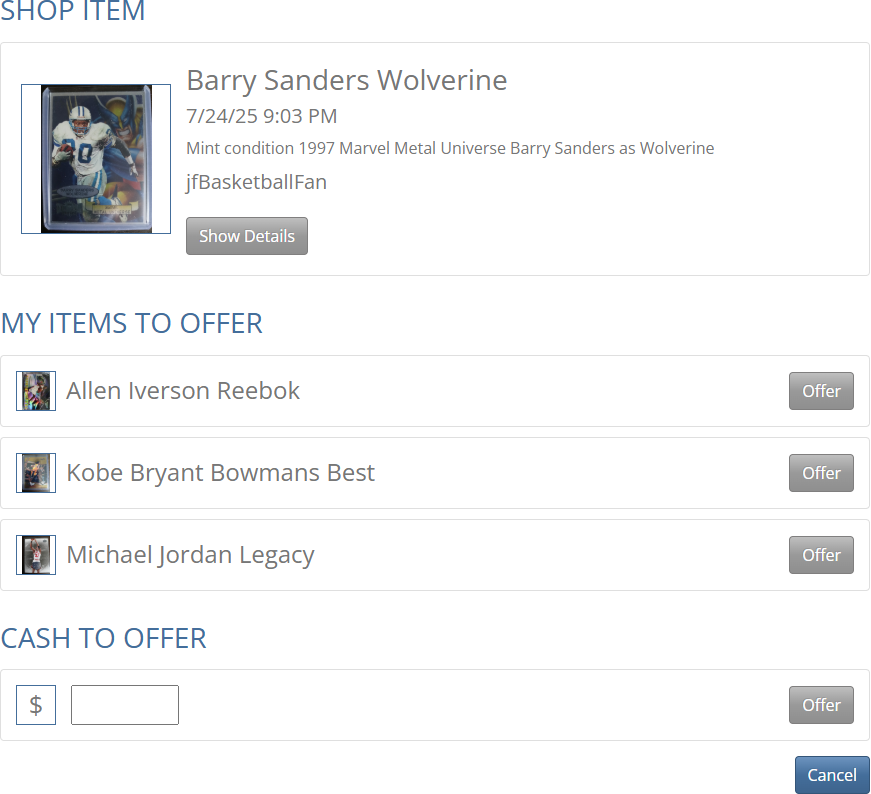 To offer an item or an entered cash amount, click the "Offer" button on the right side of it.